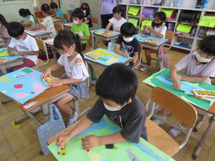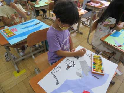 図工「やぶいたかたちからうまれたよ」の学習では,画用紙や新聞紙をすきにやぶきました。やぶいた紙をみて,「きょうりゅうに見えるな。」「お魚みたい。」と想像をふくらませながら作品をつくりました。