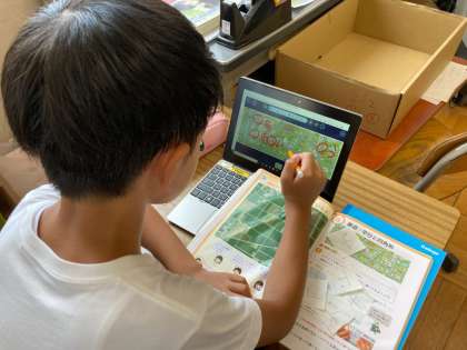町のイラストから,直線の交わり方について考えました。6種類の交差点が町のどこにあるかを探しました。