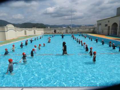 お天気も良くプール日和でした。今日は,前回よりも水位が増え潜ったり浮いたりする練習を行いました。
