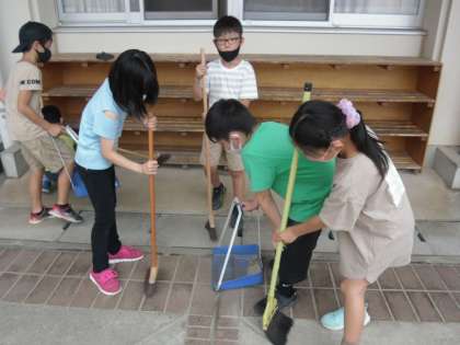 お兄さんお姉さんに上手な掃除のしかたを教えてもらいながら,みんな,はりきって掃除をしていました。