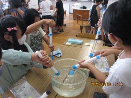 実験キットに水を入れ,力を入れて手ごたえを確認していました。