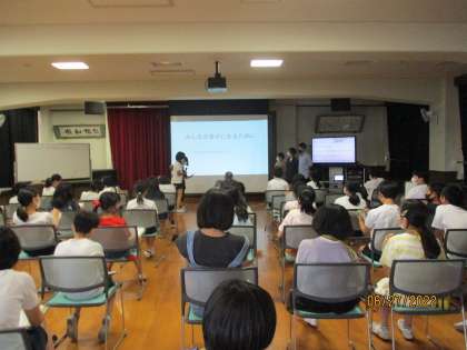 きらめきの学習で取り組んだ,「みんなが幸せになるために私たちに何ができるか。」を学年で発表しました。パワーポイントを使ってみんなに向けて上手にわかりやすく伝えることができました。質問や感想,批判的な意見も出て深まる様子が見られました。