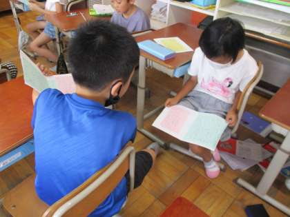 国語科の「スイミー」の学習では,レオ・レオ二の作品をたくさん読み,お気に入りの絵本についてカードにまとめて交流しました。