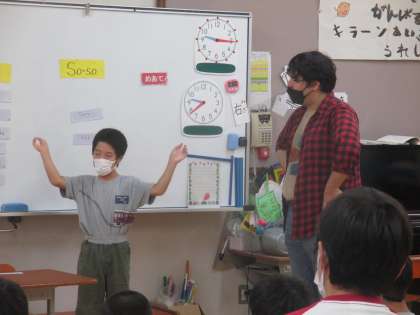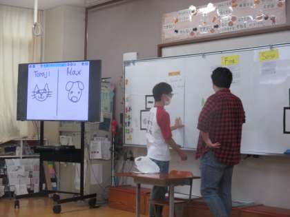 ALTのマックスと一緒に英語学習をしました。アルファベットの歌を歌ったり,アルファベットカードを使ってスペル探しゲーム(C・A・T=CATなど)をしたりしました。いつも優しくていねいに英語を教えてくれたマックスにみんなで手紙を書いてプレゼントしました。