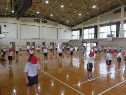 今日はスポーツフェスティバルに向けての取組として,学年練習を行いました。今はまだ動きを覚えるので精いっぱいですが,「まちとひびきあう」ような演技を目指しましょう。