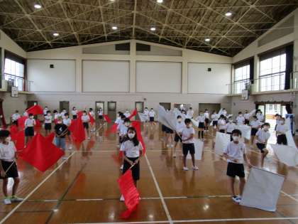 今日の練習から大旗を使っての練習が始まりました。動きは簡単ですが,揃うと迫力があってとてもかっこいいです!