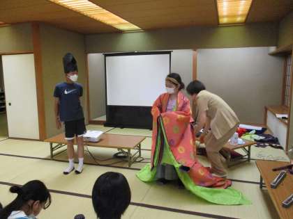 平安時代の普段着を羽織ったり,楽器に触れたりしました。