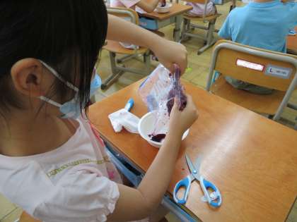 夏休みの間に集めていただいた朝顔を使って,色水あそびをしました。