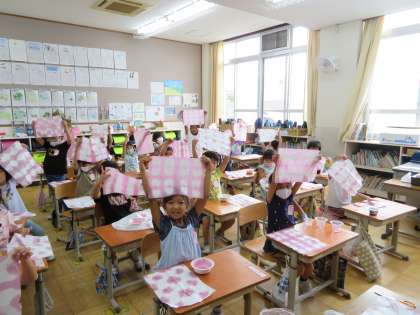 折りたたんだ和紙をそうっと広げると,「うわぁ,すごい。」と感動している様子でした。