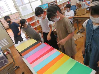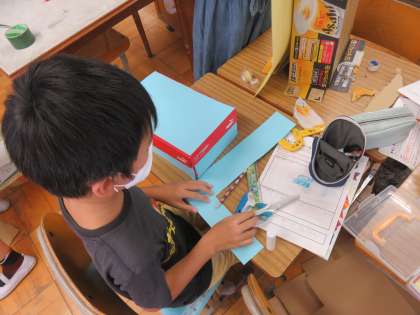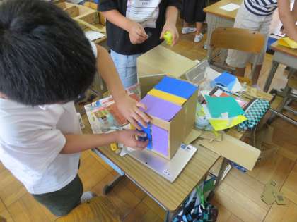 おもしろボックスの構造が決まったら,周りの飾り付けをします。広い面積は色画用紙を張り付けている児童が多かったです。絵の具などを使って模様をつけてもいいですね。作業は来週も続きます。