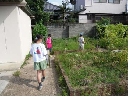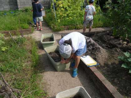 今日は実際に学校の中庭やゆめの森に行って、動物がどのようなところにいるのかを探しました。「ダンゴムシがレンガの下にいた!」「チョウチョは花の上を飛んでるね。」「バッタは草の上にいたよ。」と、生き物たちは、昨日予想した場所にしっかりといました。