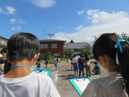 しかし,あいにく雲が多く月を見ることができませんでした。写真は方角と建物の位置関係を確認している様子です。