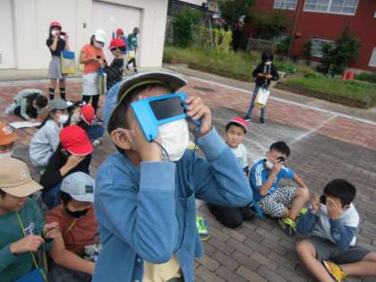 今日は「太陽と影の位置の関係」を調べるため、遮光板を使って太陽の位置を調べました。