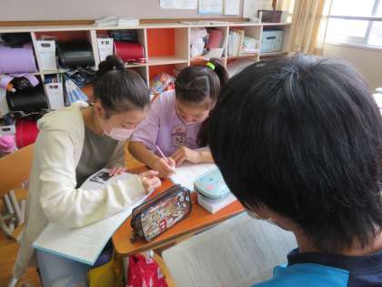 文章に線を引きながら,「やまなし」の内容について話し合う姿が見られます。
