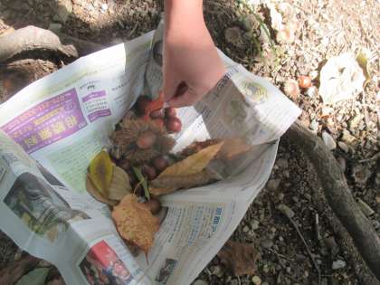 ゆめの森は秋でいっぱい。栗やどんぐり,きれいな葉。教室に少しだけもちかえって絵を描きました。