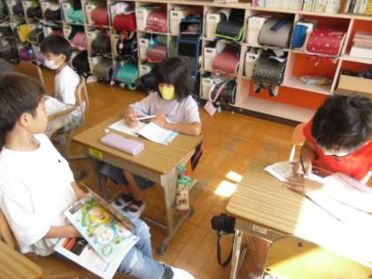 今日は「メヌエット(ベートーベン)」を聞き、自分が感じたことや気付いたことを交流しました。曲のリズムや音の上がり下がりなどから、「散歩」→「焦って走り出す」→「また散歩」など、一人一人が豊かなイメージをもっていました。