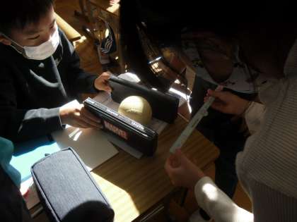「どうしたら球の直径が測れるかな?」と聞くと、「筆箱とかで挟んで測ったらいいんじゃないかな。」という意見が出てきたので、実際に測ってみました。
