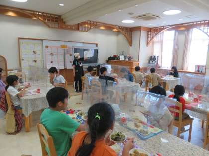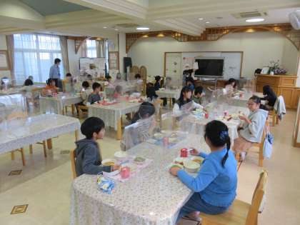 今日は,4年生1組がランチルーム給食でした。いつもとは違う雰囲気での給食を満喫している様子でした。