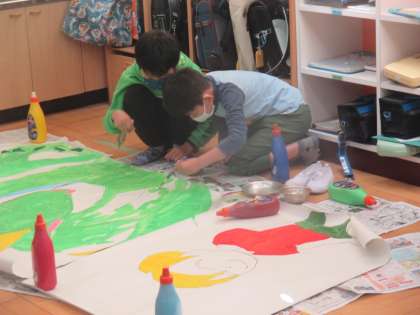 図画工作の時間,学習発表会に掲示する絵や歌詞の製作を始めました。どんな色でぬるのか相談したり,誰がどの歌詞を書くのかを決めたりして進めています。お楽しみに