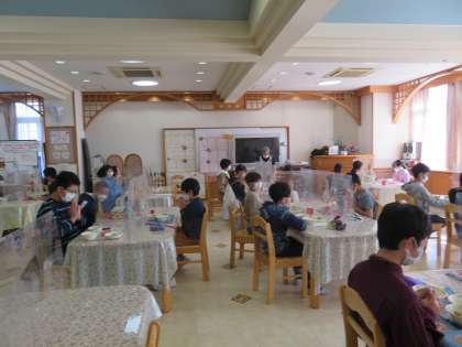 ランチルームで給食を食べました。パーテーション越しですが、対面での食事に嬉しそうな様子でした。さっと動く姿に早田先生が驚いておられました。