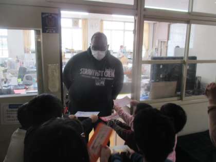 Hello! My name is 〇〇.等好きなものも英語で書いて,ジョシュア先生に手渡しで渡すことができました。