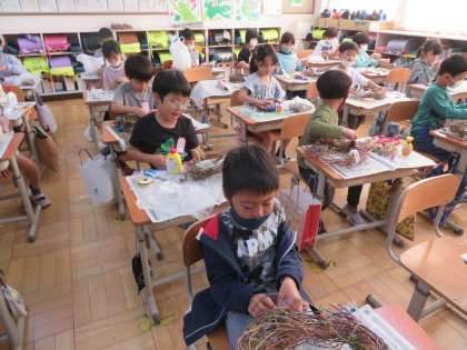 生活科の学習で育てた朝顔のつるを使ってリースを作りました。お家から持ってきたリボンやモールなどを思い思いに飾りつけました。一人ひとり,素敵なリースができました。