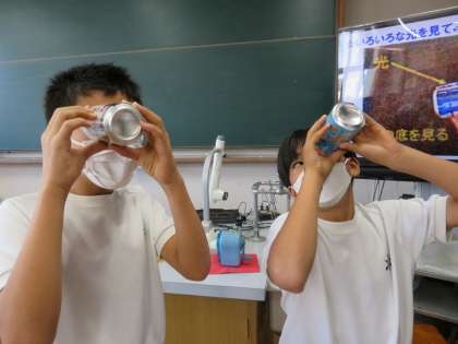 空き缶を使って実験道具を作り、みんなで観察しました。