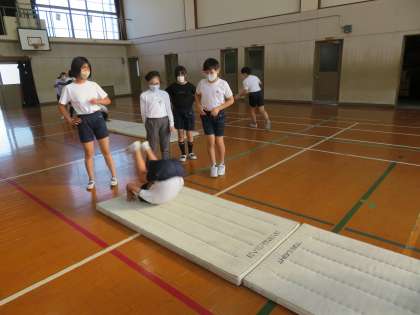 先生に見本を見せていただく場面もありました。子どもたちの考えた変なポーズを入れて、前転してくださいましたが、とても綺麗なフォームだったので、思わず子どもたちも見とれていました。