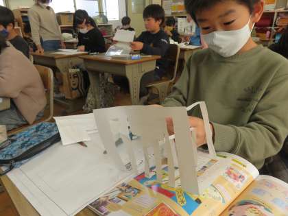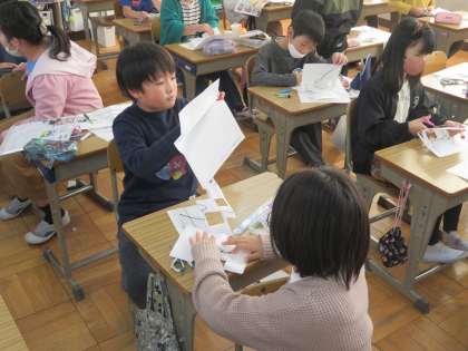作業を進めていくと、コツがつかめてきて、アイディアが浮かんできます。写真はそのアイディアを交流している場面です。図工では、友達との交流でアイディアを膨らませるのも大事ですね。