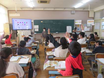 アルファベットをテーマにしたクイズ大会の練習をしました。前回は「自分が選んだ看板が何か」を出題し、どのアルファベットが入っているかを尋ねながら、相手の看板を当てました。今日は色を使って練習しました。写真は前に出て挑戦する子ども達の様子です。