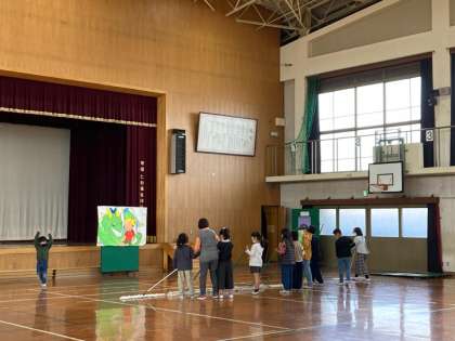 今日は3年生と2年生で協力して、たてわり掃除を行いました。写真はみんなで力を合わせて体育館のモップがけをしているところです。檀上先生にアドバイスをもらったようです。