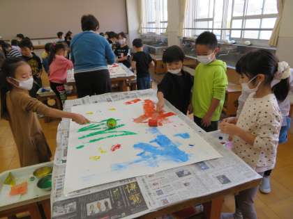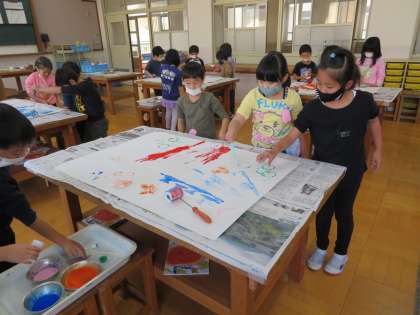 図工の学習では、絵具を使ってスタンピングをしました。身近にあるいろいろなものに絵具をつけて、どんな形が写るのが楽しみながら活動できました。