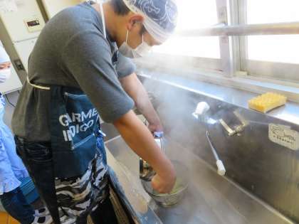 ジャガイモをゆでる作業をしました。ゆでたジャガイモをざるに出すときに湯気が上がりました。お鍋も高温になっていて火傷をしないようにグループで協力して行いました。