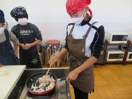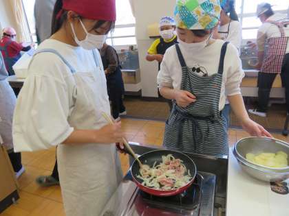 切ったり茹でたりした材料を炒めました。炒める作業は慣れているからなのか、テキパキと行動していました。「炒めるの上手いやろ!」と得意気に言っている子たちがたくさんいました。