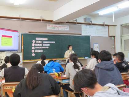 早田先生に来ていただいて、中学校に行った時のお弁当や給食についての話を聞きました。栄養バランスや彩りについて学びました。