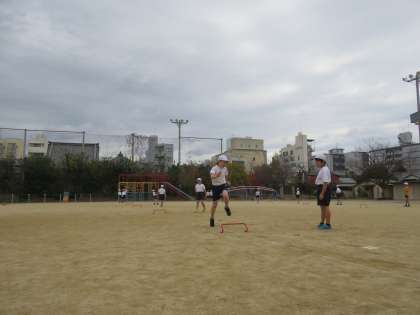 リズムに慣れてきたら、ある程度勢いをつけてミニハードルを飛び越します。今日の練習で「トン・1・2・3」の足運びで跳ぶことが、ずいぶんできるようになりました。