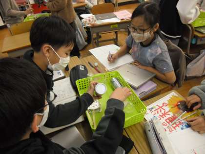 豆電球に明かりをつける学習をした後、「どのようなものが電気を通すのだろう。」という学習問題を立て、予想しました。