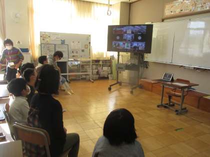 今回もリモートで,上京支部のお友達とつながりました。二条城北小学校と翔鸞小学校さんが司会をしてくれて,北総合支援学校の3年生も一緒に,10校が集まってのみんな元気会?でした。サンタの宝物ゲームでは,クリスマスツリーにかざる星やケーキなどを教室内で探しました。机に貼られた飾りに気づかず,通り過ぎたり,早くかざりたくてうずうずしたりとわいわい楽しく会に参加することができました。北総合のお友達は,1歩2歩さんぽというダンスを踊ってくれました。とても楽しいダンスで,学級でもやってみたいと思いました。また,来年会えるが楽しみです。