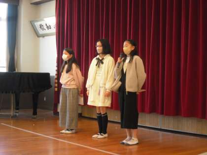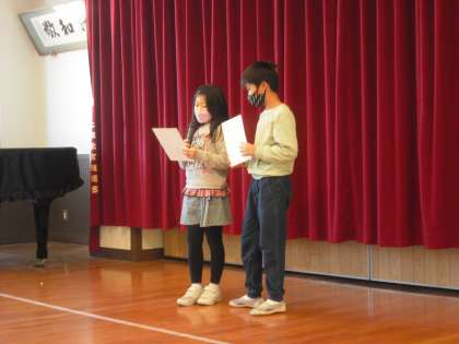 集会では、各クラスと児童会から「目標に対する成果と課題」を発表してもらいました。