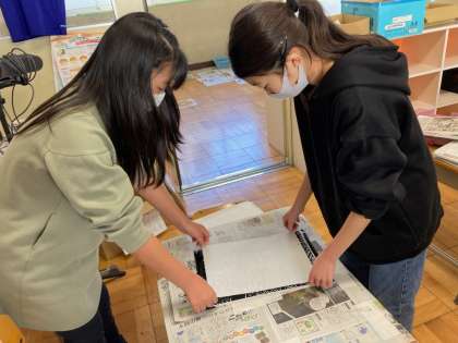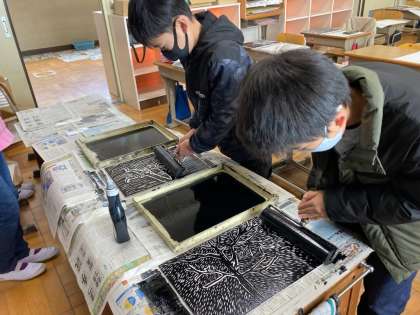 現在図工では、木版画に挑戦しています。今日は彫刻刀を使った「彫り」が終わり、「刷り」を進めました。ローラーを使って木版にインクを均一に定着させます。