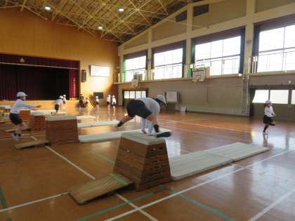 今日は「ねらい1」「ねらい2」を意識して「跳び箱」に取り組みました。「ねらい1」では高さの挑戦です。子ども達は、ふみきりや手をつく位置に気をつけながらくりかえしチャレンジしていました。