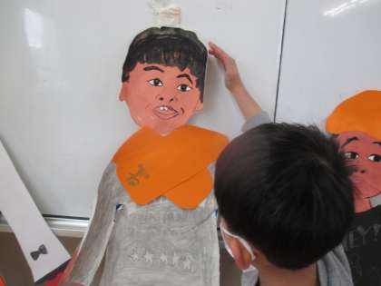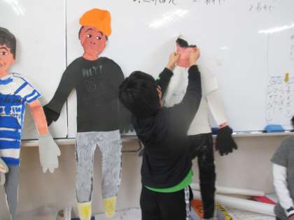 ぐっと冷え込んだ今日は,もう一人の自分に長袖やてぶくろ,マフラー等を作りました。暖かい恰好になった自分へ「いつもがんばってるね。」「かっこいいね。」と優しく声をかけていました。