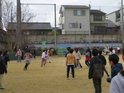 クラスの遊び係が「みんな遊び」を企画してくれました。最近は日中も肌寒い日が続きますが、一度外に出て遊び始めればどの児童も笑顔いっぱい元気いっぱいです。写真はドッチボールをしている様子です。