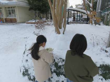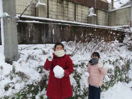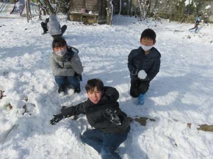 昨晩の降雪に伴い、学校は一面の雪景色でした。1時間目の体育を終えて、一息ついたらみんなで、運動場に飛び出していきました。どの児童も思い思いの遊びをしていました。