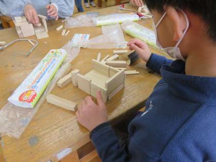 木材を並べて作品のイメージを作っている子ども達もいます。班が同様、作品展で見て頂く作品となります。完成が楽しみです。