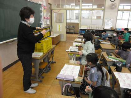 前回のおさらいをした後、2+3のように、一玉だけでは全て入れられないパターンの練習をしました。「五玉を入れて、入れすぎた分を一玉から引く」という方法で、慣れるまでには時間がかかりましたが、後半には「なるほど、分かってきた!」という声が聞こえてきました。