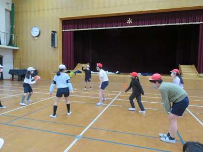 体育の学習でバスケットボールをしています。同じチームと二回対戦し、勝つためのコツを伝え合ったり作戦を練ったりしています。