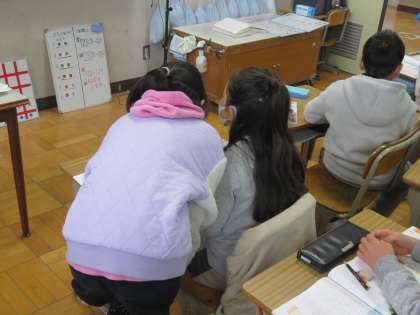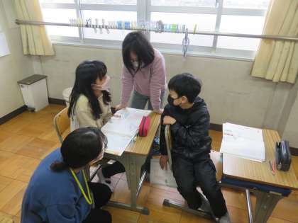 「思いやり」をテーマに自分たちの「心」を見つめました。主人公のマナブが、ボランティアを通じて人を思いやることについて、様々なことに気付きます。さて、どんなことに気付いたのでしょう。子ども達が話し合っています。