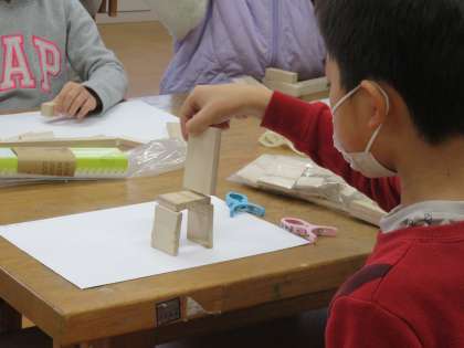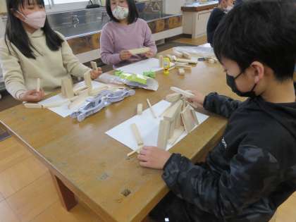今日は加工し終わった木材を使って、作品を組み立ててみました。材料の形からイメージを膨らませます。