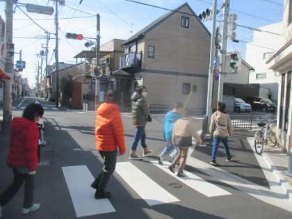 今日は、快晴の下校区にある北町児童公園へ行ってきました。交通ルールや通りの名を確認したうえで、子どもたちの力で公園まで行き来することを目指しています。